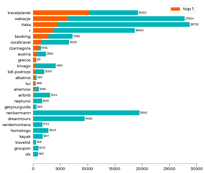 Poniższe zestawienia pokazuje domeny uszeregowane według częstotliwości występowania reklamy na pierwszym miejscu wśród płatnych wyników (kolor pomarańczowy). Dodatkowo kolor turkusowy obrazuje całkowitą liczbę przypadków, gdy znaleźliśmy reklamę danego serwisu. Wyniki łącznie dla badania desktop i mobile.