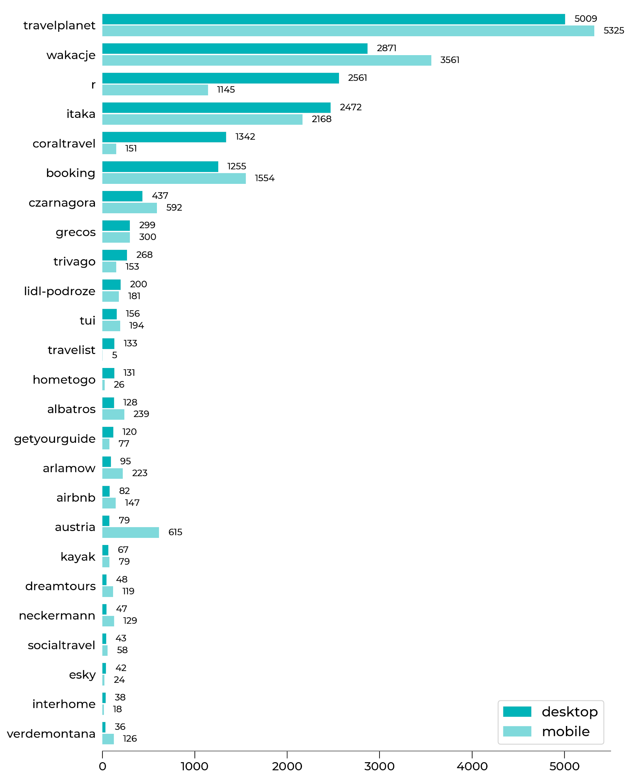 - Rozbicie danych na desktop i mobile pokazuje nam, że niektóre firmy (np. Wakacje.pl. Austria.info czy Albatros.pl) dużo częściej zajmują czołową pozycję w wynikach mobilnych.