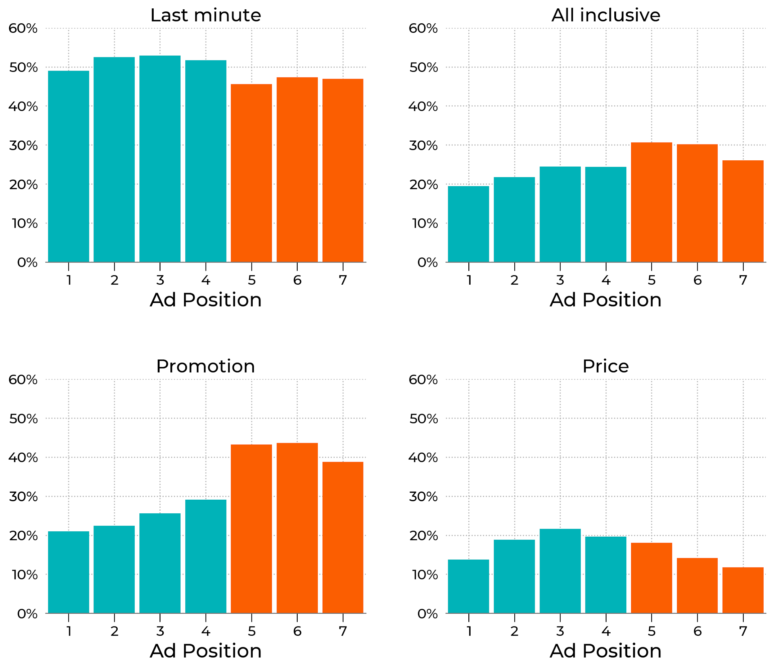 - Informacje o zniżkach i promocjach zdecydowanie częściej pojawiały się w reklamach plasujących się poniżej wyników organicznych. Podobną sytuację zaobserwowaliśmy w przypadku komunikacji opartej na All-inclusive, choć tu różnice nie były tak mocne.