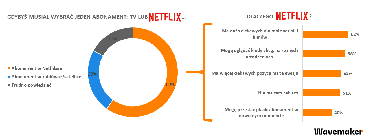 W Projekcie Cyfrowizja V agencja Wavemaker testował też scenariusz, w którym abonenci płatnej TV jednocześnie subskrybujący Netfliksa (największy serwis SVOD) muszą wybrać tylko jeden abonament. Z roku na rok rósł odsetek tych, którzy twierdzili, że zostawiliby sobie subskrypcję Netflixa, by w 2020 r. osiągnąć aż 60 proc. Dla połowy takich osób ważnym argumentem jest to, że serwis nie emituje reklam.