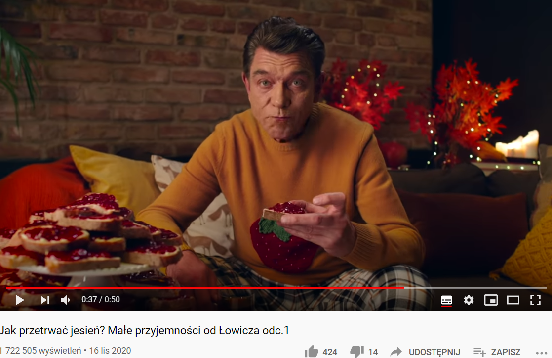 W kolejnych miesiącach pandemii marki musiały szukać sposobu komunikacji odpowiadającego sfrustrowanym i zmęczonym izolacją użytkownikom. Niektóre brandy starały się wpisać swoje przesłanie w poszukiwanie remedium na pandemiczne bolączki – w potrzebę budowania strefy komfortu w domu, z najbliższymi, najlepiej za stołem. W tę koncepcję ciekawie i z humorem wpisał się Łowicz i porady kochającego ciepełko sweterka Pana Jesieniarza, który z wdziękiem rekomenduje kanapeczki z dżemorkiem truskawkowym i aromatyczne kaszotto.
