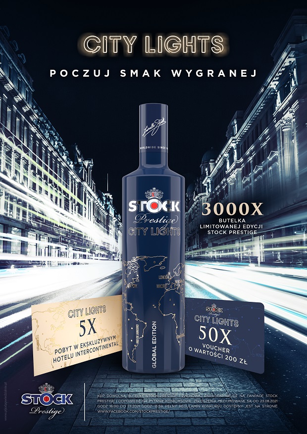 Nieodłącznym elementem corocznej kampanii marki, związanej z edycją limitowaną, jest konkurs konsumencki. W tym roku nagrodą główną jest dwuosobowy pobyt w luksusowym hotelu w Warszawie, a oprócz tego do wygrania będą inne, prestiżowe nagrody: vouchery o wartości 200 zł do wykorzystania w Apart/Eventim/Zalando/Morele.net/Netflix oraz butelki wódki Stock Prestige City Lights Global Edition o pojemności 0,7 l. Konkurs trwa do 1.11.2021. Szczegóły dostępne są na profilu marki Stock Prestige na Facebooku: facebook.com/StockPrestige.