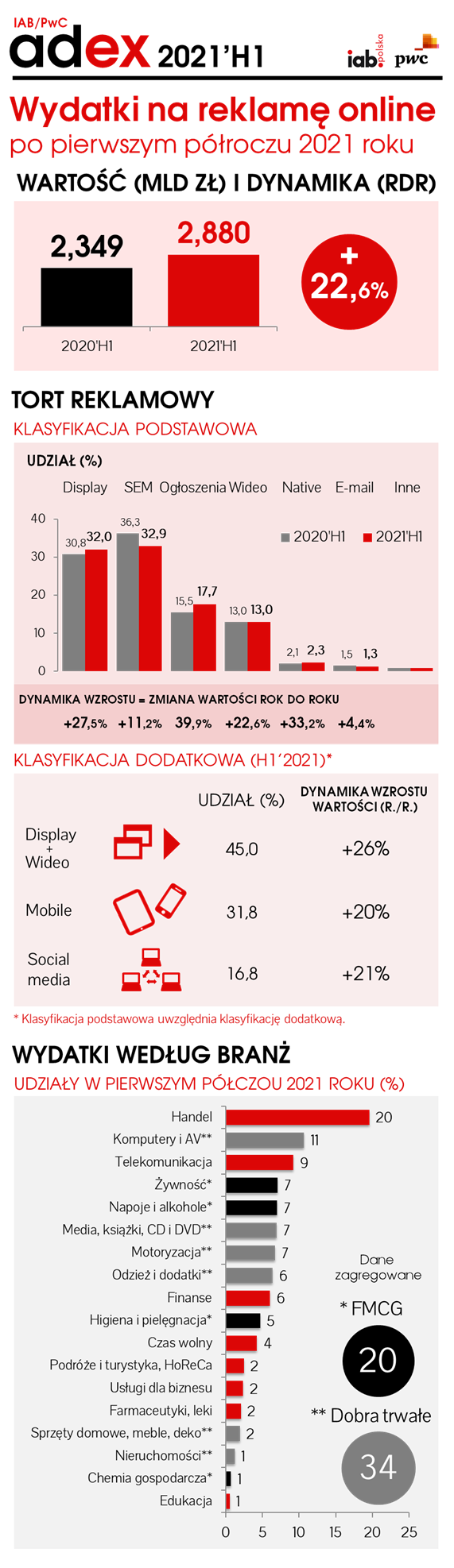 Efekt pierwszej fali pandemii z roku 2020 został przez branżę komunikacji definitywnie zniwelowany. Już pierwszy kwartał roku 2021 przyniósł wysoki indeks wzrostu na poziomie 17% – co jak na dojrzały polski rynek cyfrowy było bardzo dobrym wynikiem – jednak między kwietniem a czerwcem tempo rozwojowe jeszcze bardziej podskoczyło (o prawie 12 p.p.), do poziomu 28%. Dzięki temu w całym półroczu b.r. wartość reklamy online osiągnęła rekordowe 2,9 mld zł. To ponad pół miliarda więcej niż rok wcześniej (+22,6%).