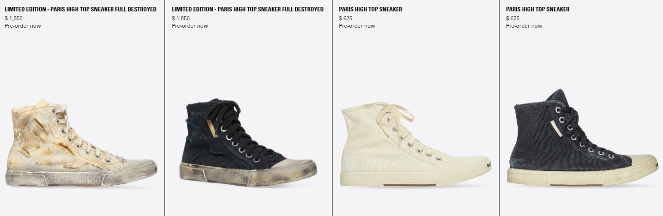 W sklepie internetowym Balenciagi dostępna jest limitowana kolekcja tenisówek „Paris Sneaker” ze specjalnymi przebarwieniami i pociętymi cholewkami, w cenie 625 dolarów lub 1850 dolarów, w zależności od modelu i stopnia „zniszczenia”. Klienci, którzy nie zdecydują się na zakup zniszczonych butów, mogą kupić „normalne” tenisówki bez cięć i zadrapań za 495 dolarów.