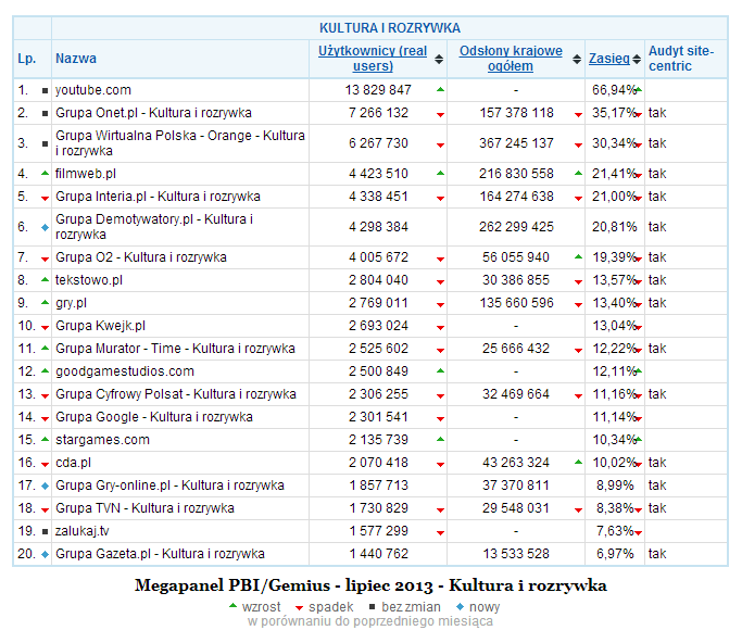 Z badań Gemiusa wynika, że ⅔ polskich internautów ogląda video na YouTube. Daje to liczbę 14 mln potencjalnych odbiorców reklamy. Facebook wprawdzie ma o niespełna milion użytkowników więcej, ale Gemius zlicza również użytkowników nieposiadających konta na FB, wpadających w okno logowania. Warto więc sobie uświadomić, że YouTube zasięgiem prawie dorównuje Facebookowi, choć nie uświadczymy go w Megapanelu w rubryce Społeczności. Jest sklasyfikowany na pierwszym miejscu wśród serwisów rozrywkowych. YouTube mimo swojej dominującej funkcji jest serwisem społecznościowym.