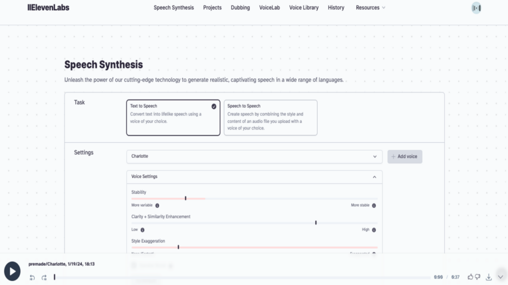 Po uzyskaniu serii interesujących nas obrazów (w tym przypadku pięciu kluczowych ujęć) możemy przejść do wygenerowania głosu lektora. Do tego celu znakomicie nadaje się ElevenLabs – model text-to-speech, który posiada sporą bibliotekę głosów (również polskich lektorów), a także możliwość regulacji wybranych parametrów odpowiedzialnych za ekspresję i naśladowanie emocji.