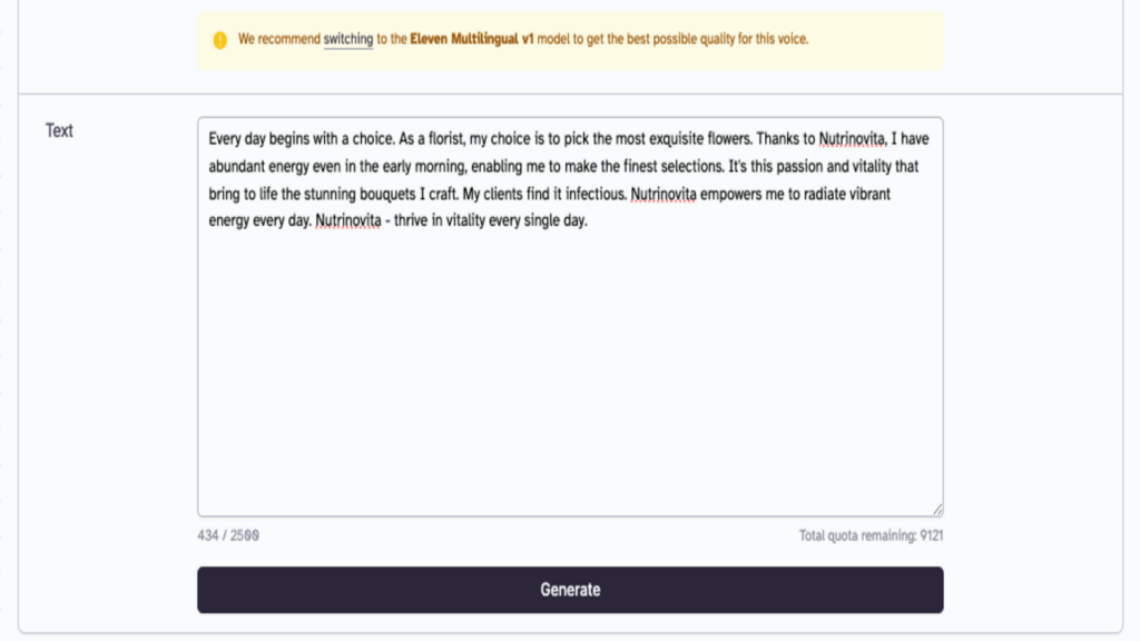 Propozycję wypowiedzi naszej kwiaciarki (voice-over) wygenerowaną wcześniej przez ChatGPT wrzucamy więc w ElevenLabs, wciskamy guzik „generate” i pobieramy gotowy plik audio w formacie MP3.