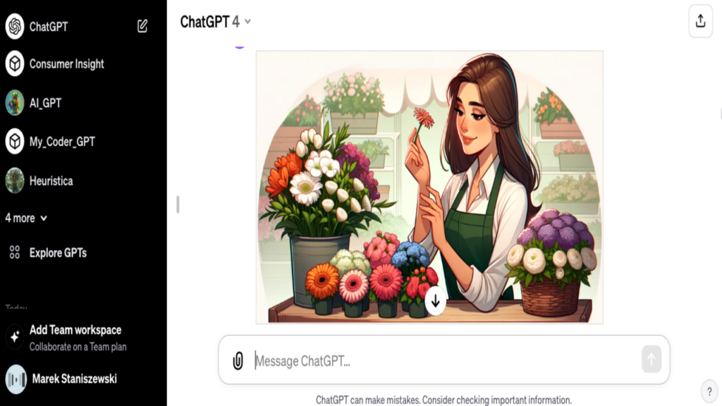 Kiedy już mamy opisane poszczególne ujęcia i wiemy, co dzieje się w warstwie dźwiękowej, przechodzimy gładko do generowania obrazów. Korzystając z DALL·E wmontowanego już zgrabnie w ChatGPT (wersja pro) lub w Copilot, otrzymywać będziemy propozycje wyglądu kolejnych klatek. Tu musimy jednak liczyć się ze sporą dozą losowości wpisaną w model. Jeśli z jakichś względów zależałoby nam, by np. postać wyglądała identycznie na kolejnych ujęciach (czyli miała tę samą twarz), to efekt ten będzie trudny do osiągnięcia w oknie ChatGPT. Należy to wtedy robić bezpośrednio w edytorze DALL-E. Działanie jest jednak bardziej czasochłonne i wymaga więcej majstrowania. Więc: jak kto lubi. Dla naszych potrzeb wystarczy, by postać wciąż była kwiaciarką, więc obrazki jak poniżej będą w zupełności OK.