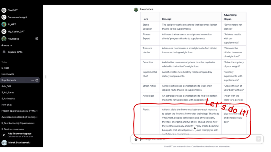 W poniższym przykładzie chcemy stworzyć reklamę dla suplementu diety o wdzięcznej nazwie NutrinoVita. ChatGPT proponuje nam na początek kilka wstępnych idei. Załóżmy, że najbardziej przypadła nam do gustu ostatnia, czyli: „Kwiaciarka”.