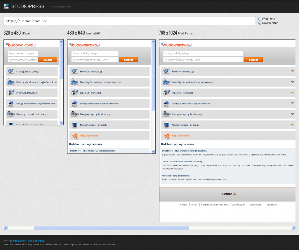 Czas i koszty: Wdrożenie trwało około 5 miesięcy, licząc od projektu graficznego aż do uruchomienia finalnego produktu. Generalnie koszty są uzależnione od liczby wersji serwisu. W przypadku Budownictwa są to 3 wersje – na komputery stacjonarne (szerokość ekranu min. 1200 px), tablety (szerokość ekranu 700-1200 px) i smartfony (poniżej 700 px, zoptymalizowane pod 320 px)). Każda z nich to dedykowany zestaw stylów w nowej technologii CSS3, które korzystają z tych samych, albo bardzo podobnych zasobów graficznych. Ponadto do każdego rodzaju urządzenia stronę trzeba zoptymalizować osobno, podobnie wygląda sytuacja z późniejszymi testami. To wszystko sprawia, że koszty uruchomienia strony w oparciu o RWD są znacznie wyższe od tradycyjnej wersji. Jeśli chodzi o budownictwo.pl było to około 25% więcej względem tradycyjnego podejścia.