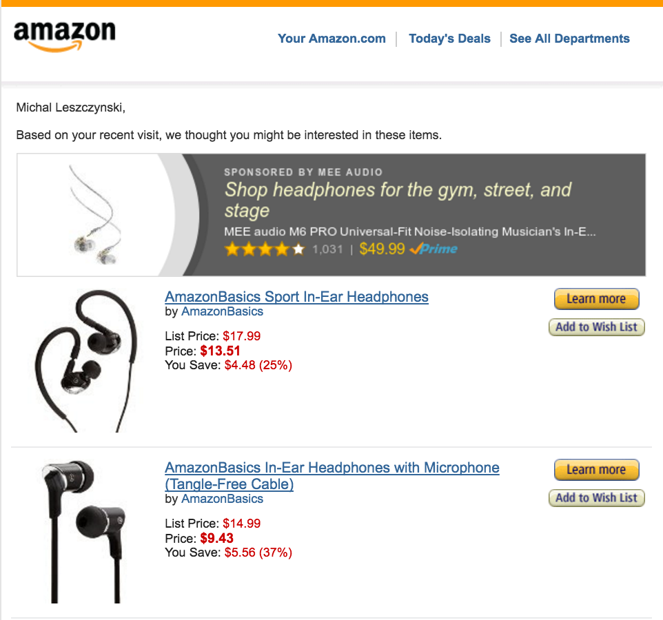 Jedną z marek, która regularnie stosuje wiadomości zawierające personalizowane treści jest Amazon. Jak możesz zauważyć z poniższej wiadomości, firma bierze pod uwagę nie tylko imię użytkownika, ale również historię wyszukiwania w serwisie, aby zaprezentować mu interesującą i przydatną treść.