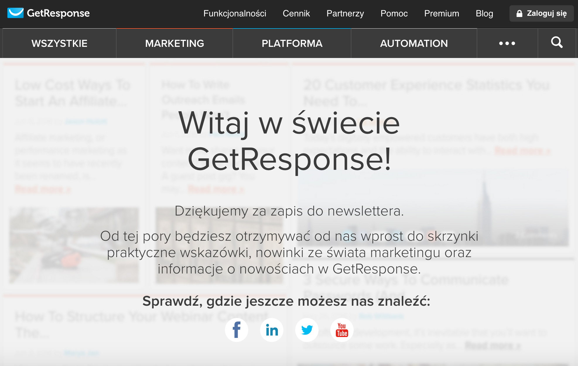 Strona z podziękowaniem za zapis do newslettera GetResponse