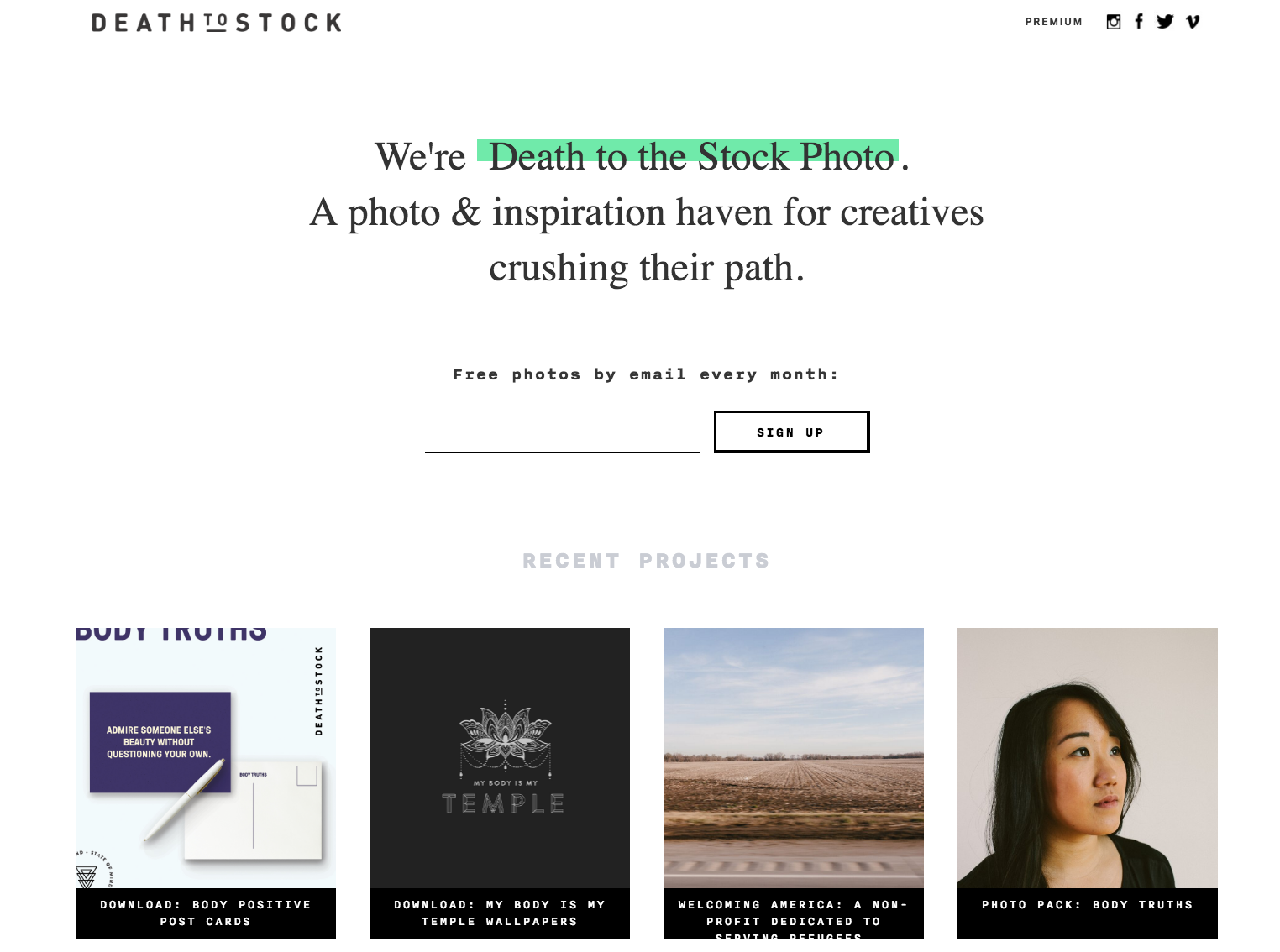 Szczególną ofertę dla swoich użytkowników przygotował na przykład serwis Death To Stock Photo. Każdy, kto dołączy do ich listy mailingowej otrzyma co miesiąc zestaw wysokiej jakości inspirujących grafik i zdjęć. Dodatkowo, żeby zachęcić do subskrypcji, Death To Stock Photo pokazuje poprzednie projekty i zestawy, które otrzymali odbiorcy ich newslettera.