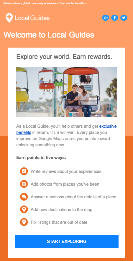 Wiadomość powitalna Google dla nowych uczestników Local Guides