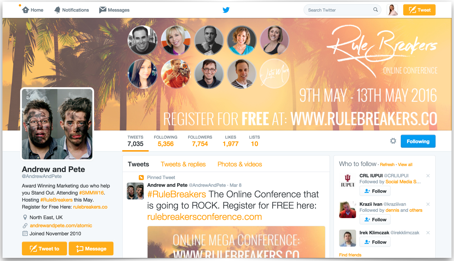 Profil organizatorów oraz tweet promujący rejestrację na konferencję Rule Breakers