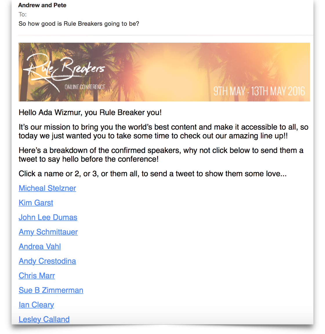 O ciągłość komunikacji zadbali również marketerzy organizujący konferencję Rule Breakers. Jak możesz zauważyć na załączonych poniżej grafikach, zachowany został nie tylko jednakowy, żartobliwy ton komunikacji, ale również grafiki wykorzystane na profilu marki, poście na Twitterze oraz w automatycznie wysłanej wiadomości powitalnej.
