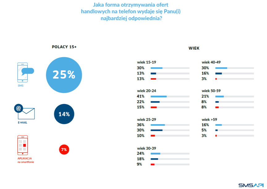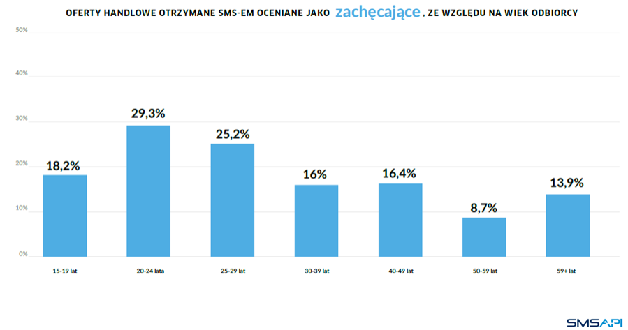 Oferty handlowe otrzymywane SMS-em są najbardziej zachęcające dla osób przed 30. rokiem życia, szczególnie wśród odbiorców w przedziale wiekowym od 20 do 24 lat, w nieco mniejszym stopniu dla osób w przedziale wiekowym 25–29. – Są to ludzie, którzy codziennie spędzają dużo czasu ze swoimi smartfonami. SMS, MMS, korzystanie z Internetu mobilnego to dla nich codzienność – komentuje Andrzej Ogonowski, PR & Marketing Director w SMSAPI.pl. – Pamiętajmy również, że młodsze pokolenie zazwyczaj jest ciekawsze nowinek i bardziej na nie otwarte niż ludzie starsi – dodaje ekspert.