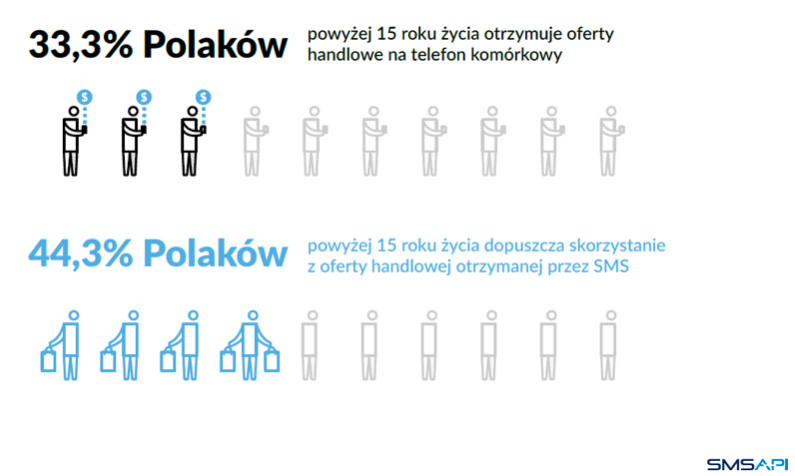 Jak pokazują wyniki badania, jedna trzecia Polaków w wieku powyżej 15 lat otrzymuje na swoje telefony komórkowe oferty handlowe. Natomiast 44,3% Polaków dopuszcza skorzystanie z oferty otrzymanej SMS-em.