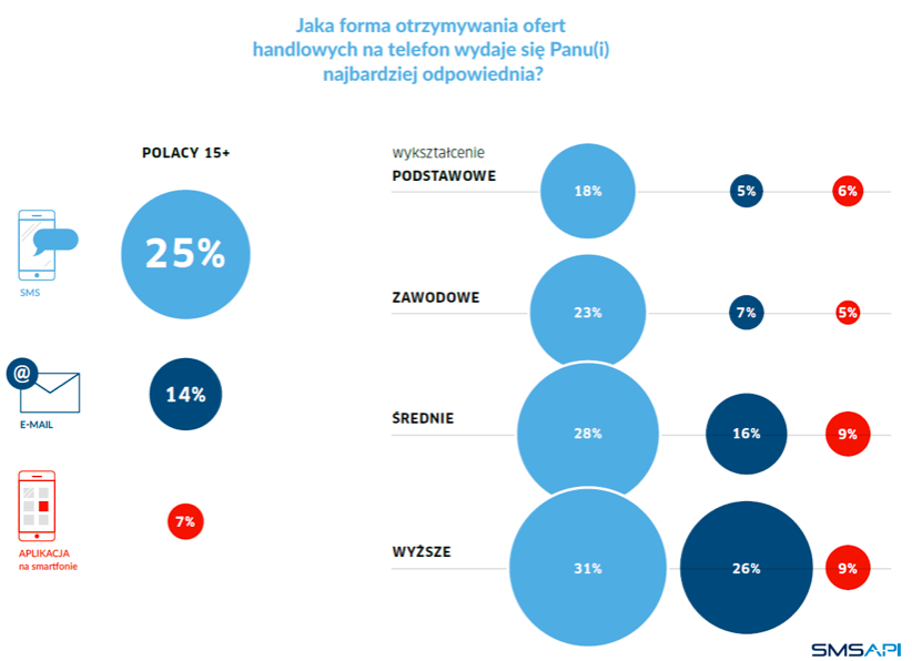 Na SMS jako najbardziej odpowiednią formę otrzymywania ofert na telefon najczęściej wskazywały osoby z wykształceniem wyższym – uważało tak 31% z nich. Wyraźny jest trend pokazujący, że im niższe wykształcenie respondentów, tym mniejsza akceptacja SMS-a jako odpowiedniej formy przesyłania ofert. Podobne tendencje wystąpiły wśród osób, które wskazywały na e-maile i aplikacje mobilne.