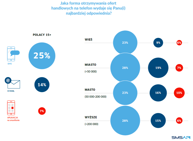 Bardzo ciekawie wypada porównanie preferencji mieszkańców miejscowości o różnej liczbie mieszkańców. Najchętniej oferty wysłane SMS-em otrzymywaliby bowiem mieszkańcy mniejszych miast, liczących do 50 tys. ludności oraz największych ośrodków, zamieszkałych przynajmniej przez 200 tys. osób.