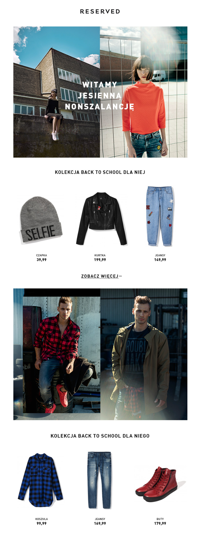 Fragment wiadomości od marki Reserved zawierający linki do kolekcji Back to School. Na podstawie kliknięć w linki można określić preferencje odbiorcy (dla niego, dla niej).