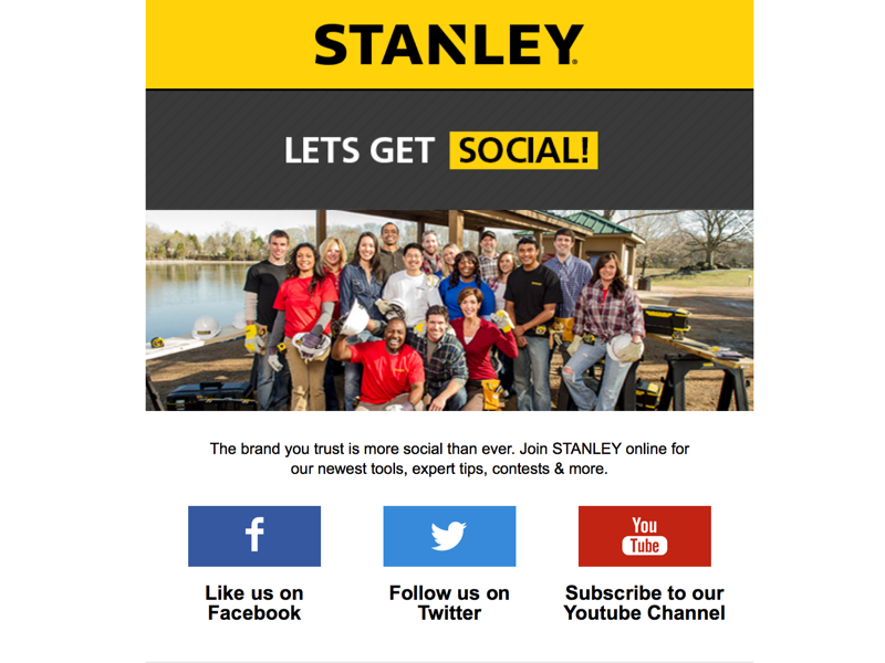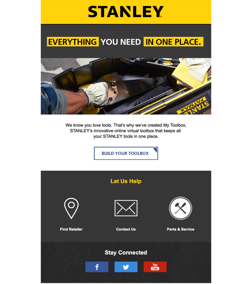 Fragment e-maila od marki Stanley wysyłanego do nowych subskrybentów. E-mail zachęca do utworzenia konta na stronie internetowej i podania większej ilości informacji na swój temat.