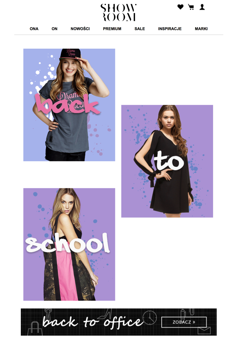 Fragment wiadomości od marki Showroom, pozwalający na określenie preferencji subskrybentów (back to school, back to office).