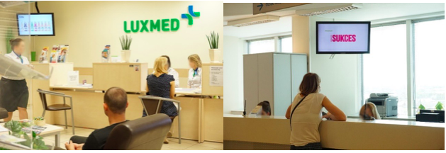 Grupa Lux Med i Medicover to największe w Polsce sieci prywatnych centrów medycznych. Łącznie sprawują opiekę nad prawie 2 500 000 indywidualnych pacjentów w prawie 200 placówkach na terenie kraju, przy czym obsługują prawie 10 000 firm. Jako, że Lux Med i Medicover to również apteki i drogerie, liczba odbiorców spotów reklamowych emitowanych w tych placówkach jest ogromna. Badania przeprowadzone przez Agencję Reklamową Be Media, która notabene posiada całkowitą wyłączność sprzedaży czasu reklamowego w ponad 120 placówkach, wykazały, że przeciętnie przed wizytą lekarską ludzie spędzają w tym środowisku około 15-20 minut. Stąd ich sposób myślenia wydaje się być bardzo podatny i chłonny na wiadomości dotyczące nie tyle zdrowia, co przede wszystkim pozostałych dziedzin życia. Z uwagi na fakt, że ponad 52 % odwiedzających centra medyczne to osoby w wieku 20-39 lat, co daje podwójną nadreprezentację populacji o największej sile nabywczej w Polsce, reklamy emitowane na prawie 350 nośnikach w strategicznych punktach placówek stają się wymarzonym rozwiązaniem dla reklamodawców najróżniejszych firm, produktów i usług.