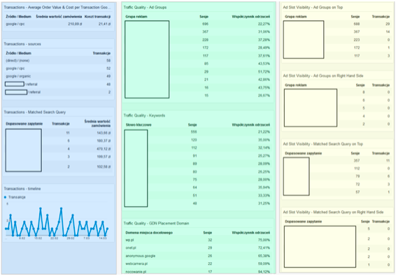 Na przykładzie działań prowadzonych dla sklepu on-line za pomocą panelu informacyjnego Google AdWords warto badać jakość ruchu za pomocą poniższych zestawów metryk.
