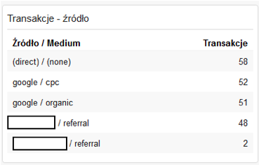 Analiza źródeł transakcji umożliwia wyznaczenie najważniejszych kanałów generujących sprzedaż na stronie oraz określenie priorytetów prowadzonych działań reklamowych.