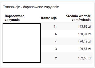 Analiza wyszukiwanych haseł pod kątem liczby transakcji oraz średniej wartości zamówienia umożliwia wyznaczenie najbardziej wartościowych słów kluczowych dla naszego sklepu.