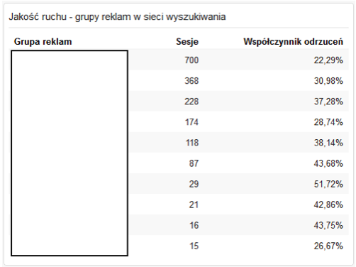 Analiza jakości sprowadzanego ruchu na poziomie grup reklamowych generujących największy wolumen ruchu umożliwia szybką weryfikację, czy budżet kampanii jest efektywnie wykorzystywany.