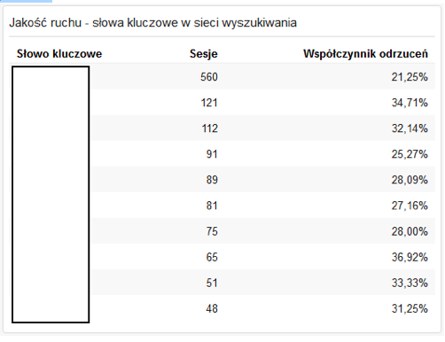 Analiza jakości sprowadzanego ruchu na poziomie słów kluczowych o największym wolumenie ruchu umożliwia szybką weryfikację słów kluczowych pod kątem ich efektywności.