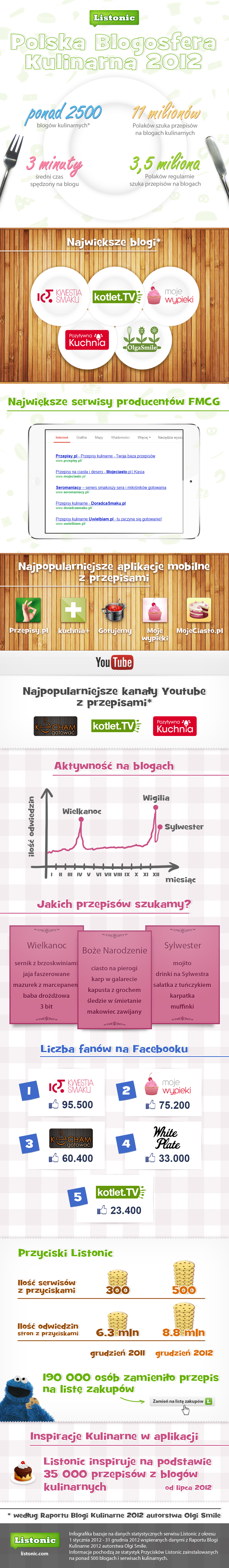 Przepisy kulinarne z blogów stały się nieodłączną częścią kulinarnych wyzwań. Ponad 3,5 miliona Polaków szuka ich w sieci regularnie. Najczęściej szukamy przepisów na Kwestii Smaku, Kotlet.tv, Moich Wypiekach, Pozytywnej Kuchni i u Olgi Smile. Przepisy kulinarne można znaleźć także na stronach producentów spożywczych oraz w aplikacjach mobilnych. Między innymi w Inspiracjach Kulinarnych w aplikacji Listonic – wygodna lista zakupów, gdzie publikowane są najnowsze przepisy z blogów kulinarnych.