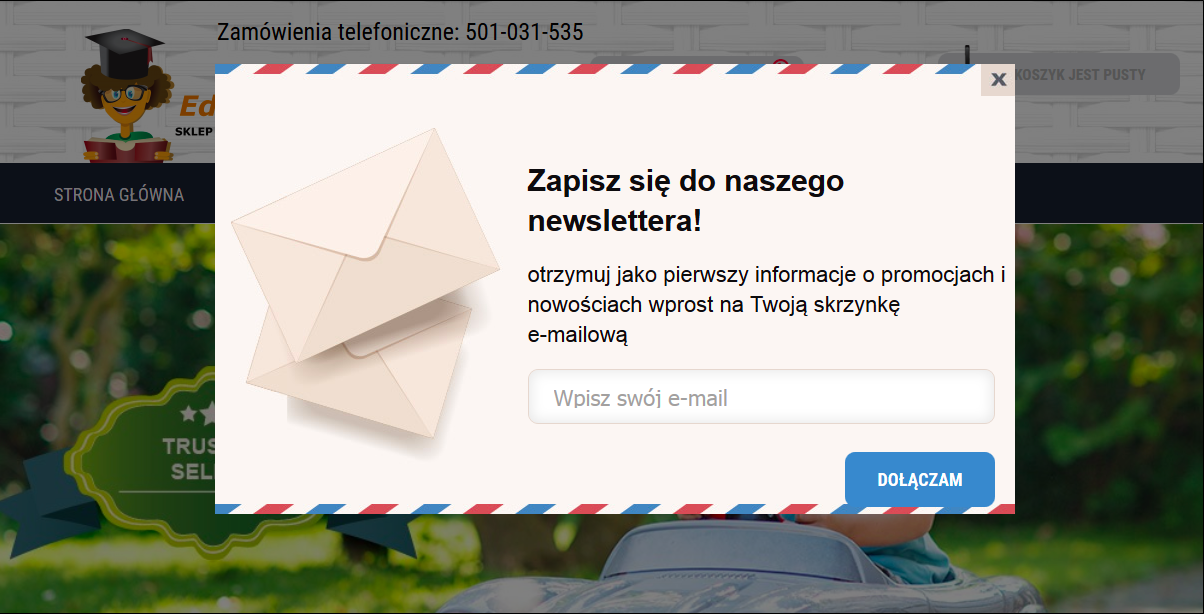 Chcesz zwrócić uwagę odbiorcy na wybrane ważne treści? Możesz to zrobić za pomocą okna pop-up. Użytkownikowi po wejściu na stronę Twojego sklepu internetowego wyskoczy box z informacją. Okno pop-up możesz wykorzystać na różne sposoby. Zamieść w nim informacje na temat rabatu, specjalnej promocji czy nowych produktów już dostępnych w witrynie. Co jeśli specjalna oferta minie? Spokojnie, zmienisz wtedy treść w boxie. W Sky-Shop masz również możliwość zamieszczenia drugiego okna pop-up, zachęcającego do subskrypcji newslettera. W tym komunikacie daj konsumentowi wartość dodaną. Poinformuj, że jeśli zgodzi się na otrzymywanie maili, będzie jako pierwszy wiedział o promocjach lub dostanie specjalny rabat. Dzięki temu poszerzysz swoją bazę mailingową, a wysyłając spersonalizowane wiadomości będziesz mógł liczyć na składanie zamówień przez odbiorców. Spójrz, jak wykorzystuje okno pop-up sklep internetowy Edukamp, działający na platformie Sky-Shop.