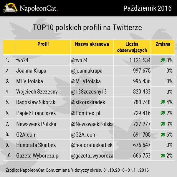 W TOP10 znaleźli się: TVN24, MTV Polska, Newsweek Polska, Gazeta Wyborcza (@Gazeta Wyborcza.pl), oraz Radosław Sikorski. Podobnie jak na Instagramie na Twitterze nie brakuje sportowców oraz osób związanych z showbiznesem. W pierwszej dziesiątce znaleźli się między innymi: Joanna Krupa, Wojciech Szczęsny czy Honorata Skarbek. Warto zwrócić uwagę, iż w ścisłej czołówce jest również profil Papieża Franciszka (@Pontifex_pl) oraz globalnej platformy G2A.com, która zanotowała największy przyrost obserwujących miesiąc do miesiąca.