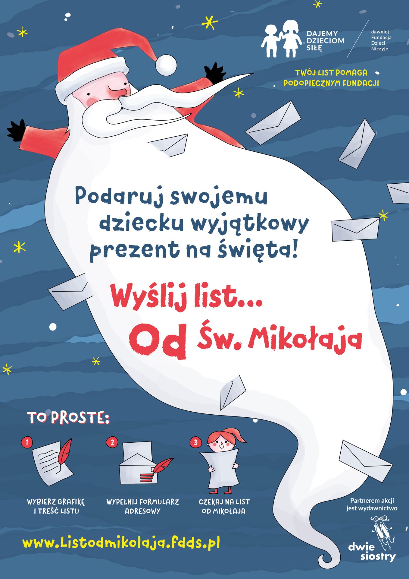 Do 19 grudnia na stronie www.listodmikolaja.fdds.pl, za pomocą dostępnych treści i grafik, można przygotować list, który dotrze do dziecka na święta. Każdy zamówiony list to realna pomoc dla dzieci, którymi opiekuje się Fundacja Dajemy Dzieciom Siłę.