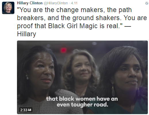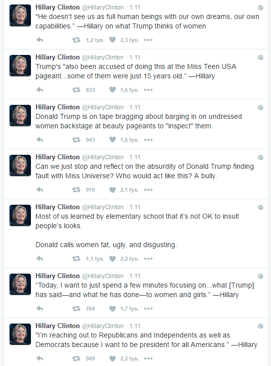 Powyższa przywara jest widoczna szczególnie w komunikacji na Twitterze, w którym tweety są zdepersonalizowane i generyczne – Hillary Clinton (czy raczej jej sztabowcy) odnosiła się w nich często do siebie w trzeciej osobie i często publikowała swoje własne cytaty, podpisując je jeszcze swoim imieniem. Na pierwszy rzut oka widać, że to nie ona komunikowała się ze swoimi wyborcami.