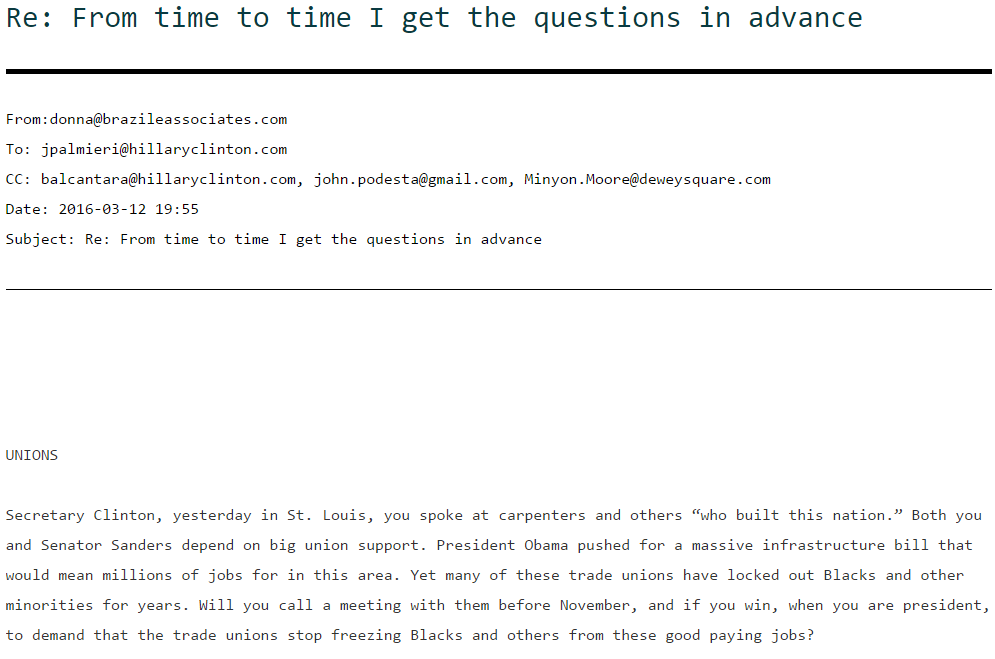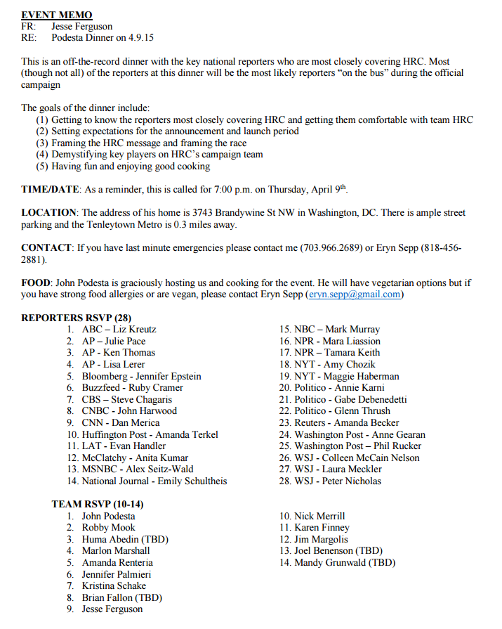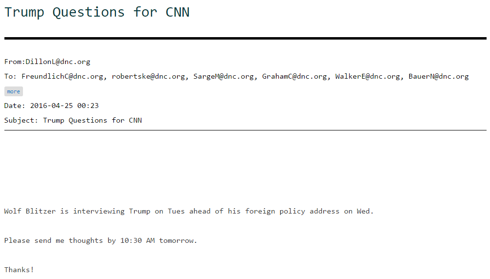 CNN miało jednak więcej do ukrycia w tej sprawie niż tylko kompromitujące dla Hillary Clinton materiały. Dzięki wyciekom Wikileaks okazało się m.in. że szereg wpływowych dziennikarzy z różnych mediów brał udział w prywatnej kolacji z przedstawicielami sztabu Hillary Clinton, na której ustalano wspólnie narrację, według której będą raportować o kandydatce, jak również że Konwencja Demokratów pisała pytania do wywiadu Wolfa Blitzera (CNN) z Donaldem Trumpem, czy że Donna Brazile udostępniała czasami pytania przed wywiadami z Hillary Clinton, w tym również pytania, które znalazły się w jej debacie z Berniem Sandersem w marcu 2016.