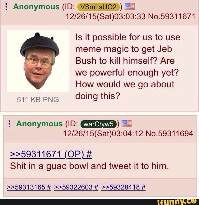Kontekst I: Jeb Bush uruchomił na swojej stronie sklep internetowy z gadżetami związanymi z jego kampanią, pośród których znalazła się nieobrandowana misa do guacamole wyceniana wyżej niż podobne produkty na Amazon i eBay. Produktowi towarzyszył opis: „Jeb and Columba love whipping up guacamole on Sunday Funday. Now, you can get in on the act with this “Guaca Bowle.” Jeb’s secret guacamole recipe not included…yet”. W ten sposób Jeb Bush stał się „foolish guac bowl merchant”.