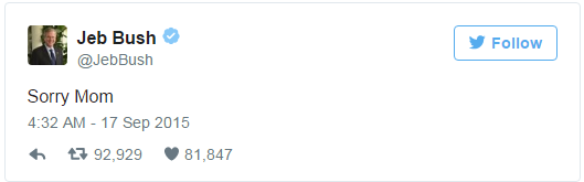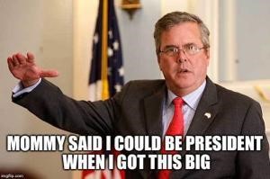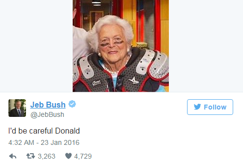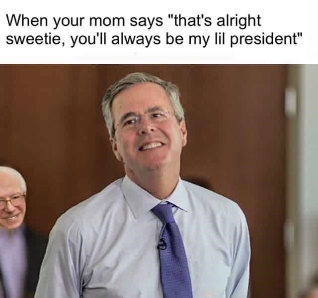 Kontekst IV: Jeb Bush wykorzystał w kampanii wyborczej endorsement własnej matki oraz zdjęcie, na którym ubrana jest w sprzęt do amerykańskiego footballu, którym chciał wystraszyć Trumpa. Jest to nieliczny przypadek, w którym kandydat stworzył mema hejtującego samego siebie.