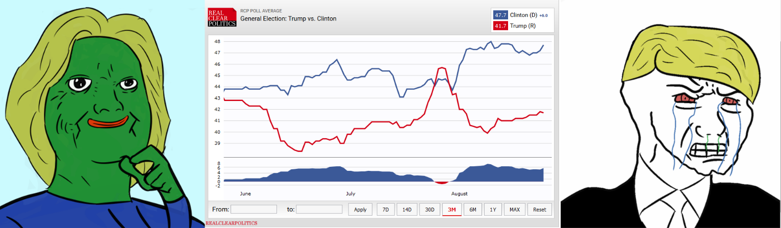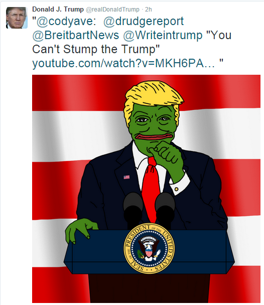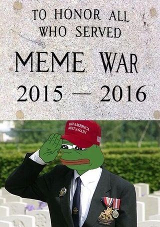 Kiedy skończyły się prawybory, na polu bitwy zostało tylko dwóch kandydatów – Donald Trump oraz Hillary Clinton. W kontekście wojny memów oznaczało to, że jeden z kandydatów ma za sobą oddolnie i samoistnie zbudowaną armię trolli-weteranów a drugi(a) głównie zatrudnionych ludzi od trollowania z wyznaczonym budżetem 1 miliona dolarów. Donald Trump tymczasem już na początku 2016 przychylił czapki swoim internetowym bojownikom tweetując jeden z memów z hasłem, które również zostało stworzone przez nich, „Can’t Stump The Trump”, oraz swoim wizerunkiem bazowanym na żabie Pepe.