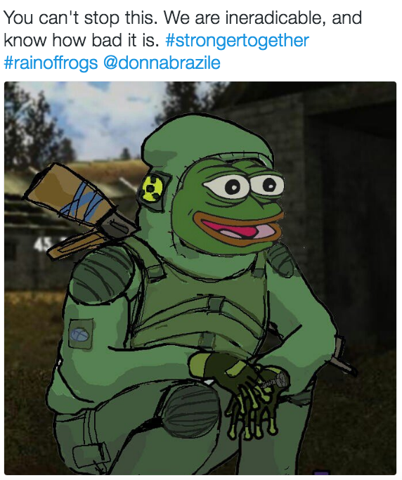 Głównym problemem pro-Clintonowskich memów był brak polotu i szalonej fantazji, która cechowała memy zwolenników Trumpa – były one po prostu zbyt poprawne. Inną kwestią było również to, że doświadczeni twórcy memów, z natury często obraźliwych, nie popierali Clinton ze względu na promowanie przez nią politycznej poprawności, nie miała więc ona takiej bazy jak Trump, który polityczną poprawność miał głęboko gdzieś i dzięki temu zdobył ich lojalność. Hillary Clinton zaatakowała więc w trakcie wiecu w Reno w Nevadzie memy promujące Trumpa i ogłosiła żabę Pepe symbolem alternatywnej prawicy i białej supremacji, a samych twórców memów – wszystkiego rodzaju fobami. W trakcie przemówienia przerwał jej okrzyk „PEPE!” dobiegający z widowni.