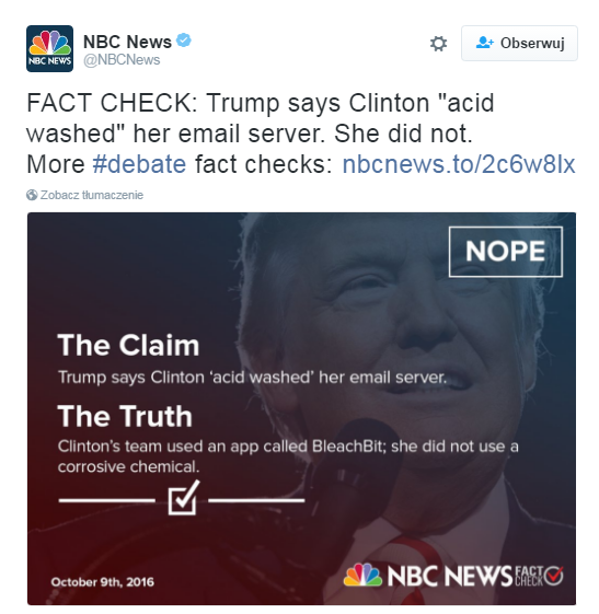 Kalkulowana pomyłka: W trakcie debaty prezydenckiej transmitowanej przez NBC Trump mówi o tym, że Hillary Clinton „umyła kwasem” swój serwer z mailami. NBC poprawia jego błąd na swojej stronie w ramach „NBC News Fact Check” i prostuje, że nie użyła do tego kwasu tylko oprogramowania BleachBit, potwierdzając sedno jego argumentu.