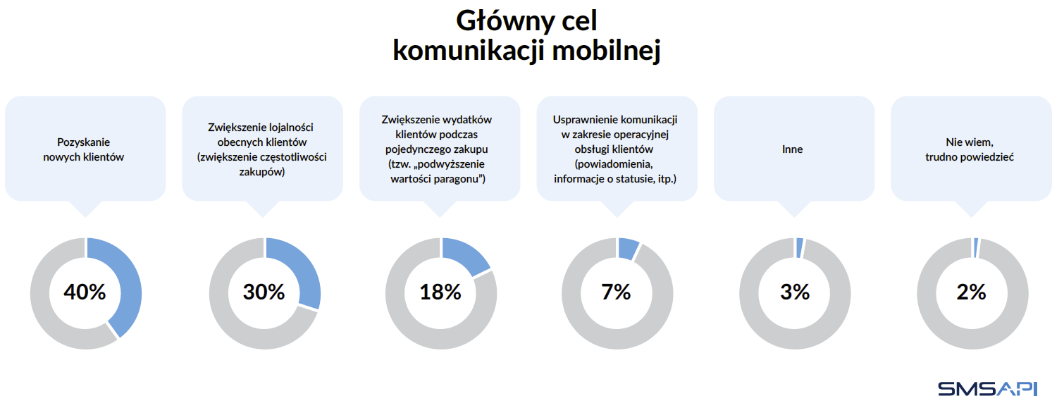 Sklepy stacjonarne komunikują się mobilnie przede wszystkim w celu pozyskania nowych klientów oraz zwiększenia lojalności klientów, którzy już kiedyś dokonali zakupu w sklepie. W dalszej kolejności wymieniane były: zwiększenie wartości pojedynczego paragonu oraz usprawnienie komunikacji.