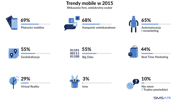 Z badania Ipsos Polska i SMSAPI.pl wynika, że sklepy stacjonarne jako wiodące trendy w komunikacji mobilnej postrzegają: płatności mobilne (69%), wykorzystanie mobile jako element kampanii wielokanałowych (68%) oraz automatyzację i remarketing (65%).