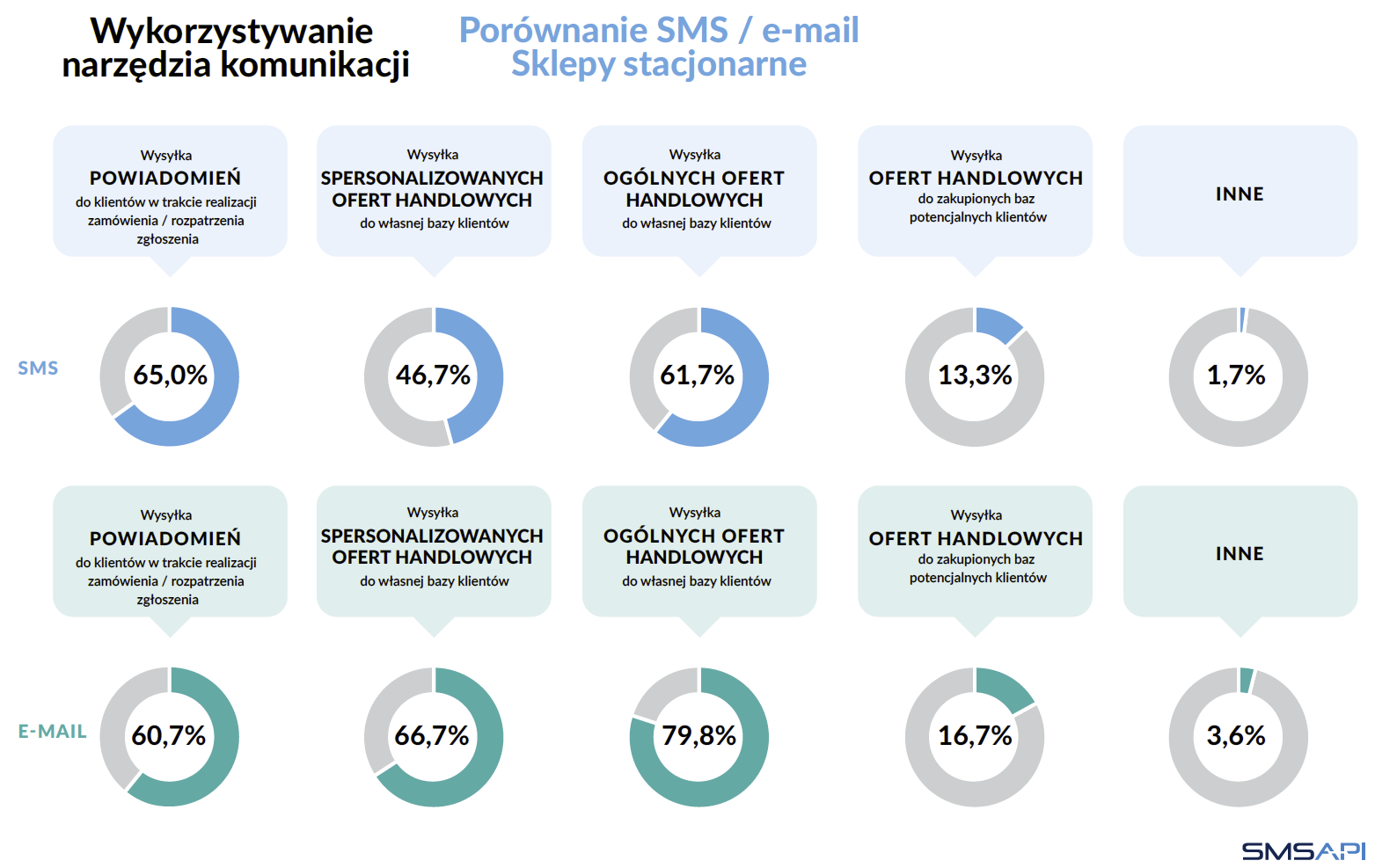 Marketerzy sklepów tradycyjnych używają SMS-ów najczęściej do wysyłki powiadomień do klientów w trakcie realizacji zamówienia lub rozpatrzenia zgłoszenia. Ogólne oferty handlowe wysyła w ten sposób do własnej bazy kontaktów niespełna 62% sklepów, a spersonalizowane – niecałe 47%. W przypadku e-maili ten odsetek wynosi odpowiednio: niecałe 67% i niecałe 80%.