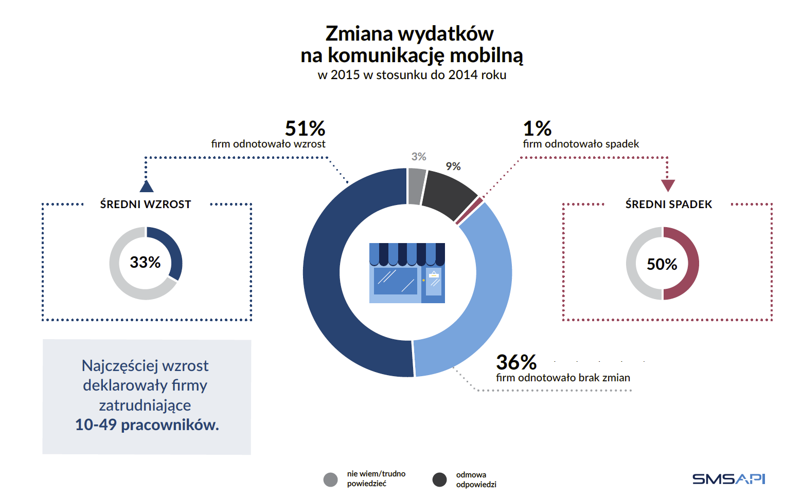 Sklepy stacjonarne wydają coraz więcej, aby komunikować się z klientami mobilnie. Ponad połowa z nich zadeklarowała, że ich wydatki na ten cel w 2015 roku wzrosły w porównaniu do wydatków z roku poprzedniego. Średni wzrost wydatków wyniósł 33%. Tylko 1% sklepów zadeklarował, że zmniejszył wydatki na komunikację mobilną.