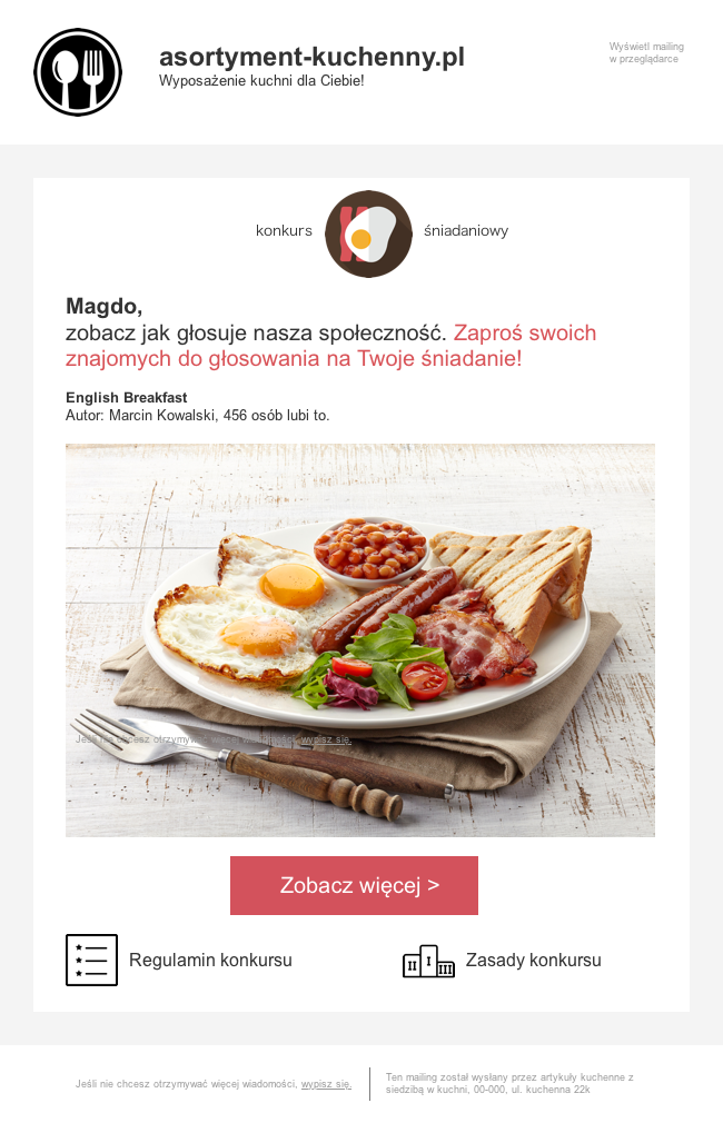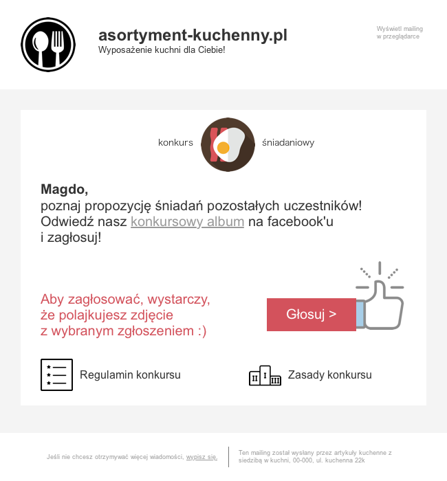 Kolejnym mailingiem (mailing #2), który wyślemy w przypadku naszego przykładowego konkursu, będzie zaproszenie do głosowania. Tutaj chcemy przekierować odbiorców na fanpage, do albumu ze zgłoszeniami, aby dać im szansę na dodatkowe zaangażowanie się. Potencjalnie zwiększy to więź z naszą marką. Przykład:
