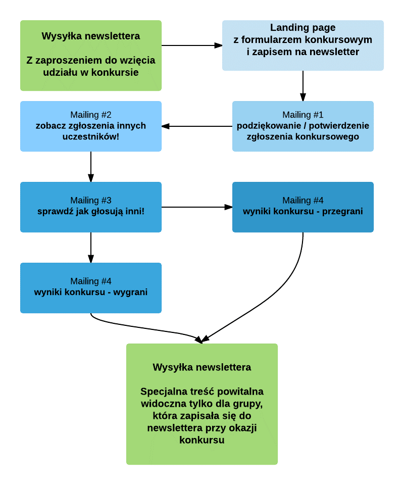 Co dalej? Wysyłamy przecież regularnie newsletter. Musimy więc zadbać o to, aby grupa druga, czyli ta, która zapisała się na newsletter przy okazji naszego konkursu została płynnie wprowadzona w tok regularnych wysyłek.